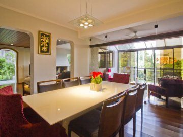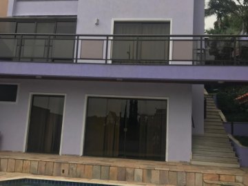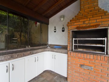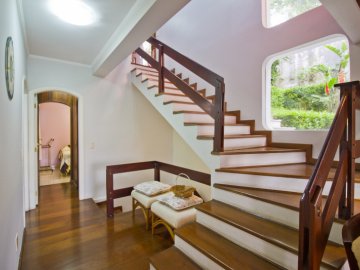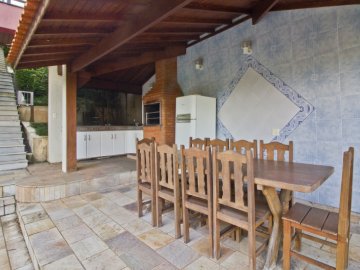 Casa com 3 pavimentos e corredor lateral. Dispõe de living para 2 ambientes com lareira, varanda aberta e vista para o jardim e piscina. Conta com sala de jantar integrada ao jardim de inverno envidraçado. Toda casa possui piso em madeira e vista para área verde. Conta com cozinha com armários Elgin, piso e bancada em granito, ampla despensa e dependência de funcionária completa. O aquecimento é a gás e solar. Na área íntima, dispõe de 4 suítes sendo uma delas com varanda individual. No andar inferior, possui sala com lareira que dá acesso à piscina e espaço gourmet. Vista externa para grande área de preservação ambiental.
