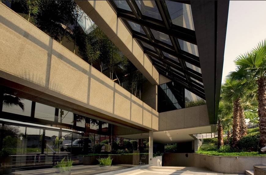 Imóvel em rua nobre do Morumbi, acesso fácil pela Marginal Pinheiros, em esquina de grande visibilidade entre duas praças arborizadas para uso dos funcionários. Arquitetura assinada por arquiteto renomado.